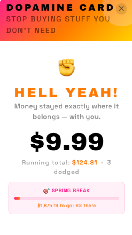 Budget trackers and savings apps only work if you remember to update them. Dopamine Card interrupts your shopping as it happens.